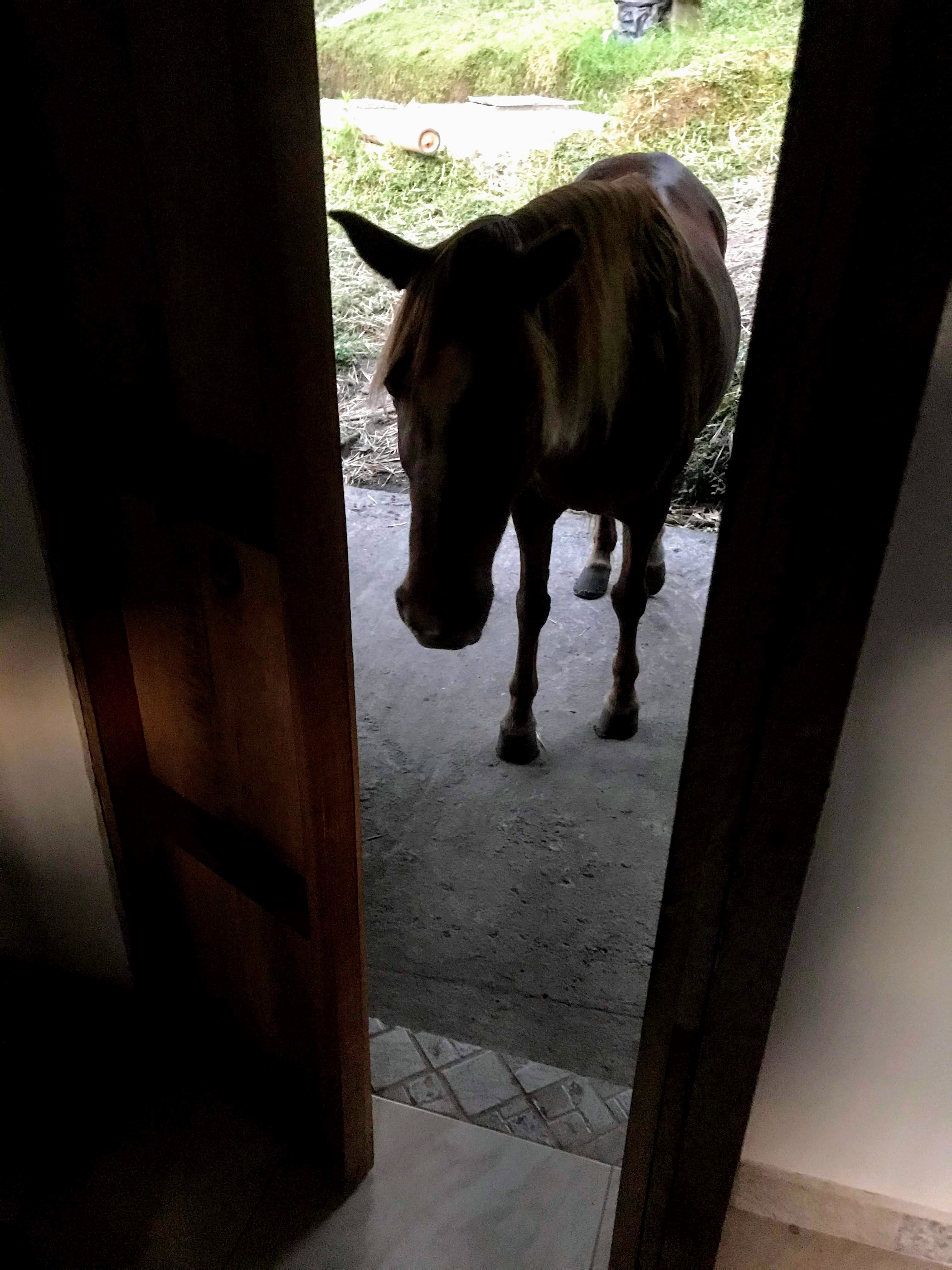 This was my first time staying at a hostel. Overall, I'd say the experience was not bad. I met an interesting lady from Spain who practices permaculture. She told me that shampoo is unnecessary for washing hair; in fact, pure water produces the best results. There was also a horse at the hostel. It was staring into our room when I woke up.